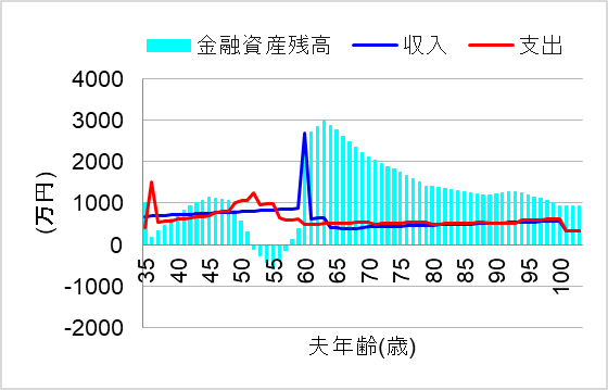 では最後に、教育費ピーク後(夫60歳定年時)に1000万円繰り上げ返済した場合についてシミュレーションしてみます。このケースでは、子どもたちが私立の高校や大学に進学する可能性も踏まえて、繰り上げ返済はしばらくお預けにしたのです。